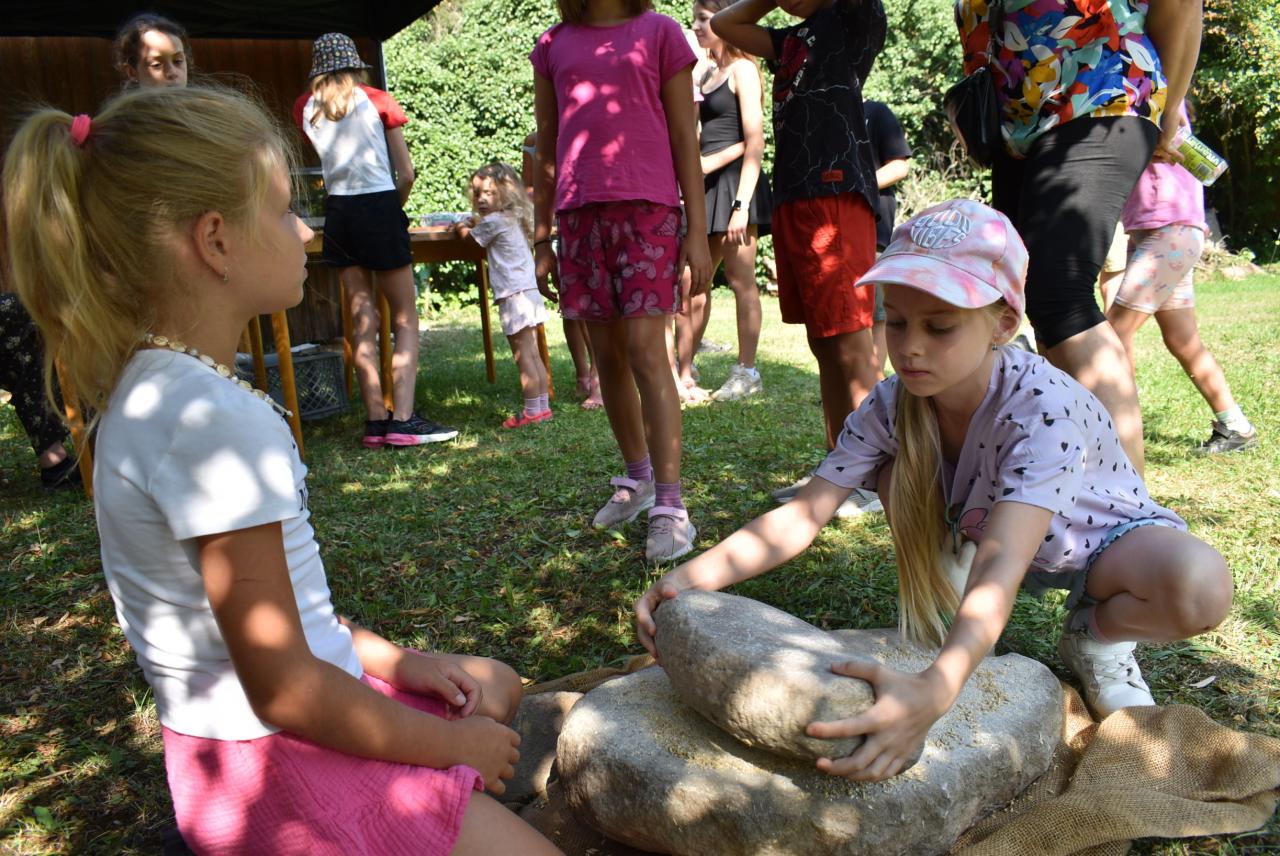 Návštěvníci, jimiž byli jak dospělí, tak děti, které přicházely s příměstskými tábory nebo individuálně s rodiči či prarodiči, si mohli vyzkoušet nejen mletí obilí kamenem jako v pravěku, ale také přípravu těsta na placky, pečení a ochutnávání. Připravena byla možnost tvoření opět, ale také poznávání druhů obilí podle zrn. „Máme k dispozici Petriho misky, ve kterých jsou obiloviny, aby si děti oživily, jaké máme různé druhy. Zároveň chceme připomenout plodinu, který není tak tradiční a rozšířená, což je pohanka. Takže mohou děti ochutnat i zapečenou pohanku,“ doplnila Eva Butková.