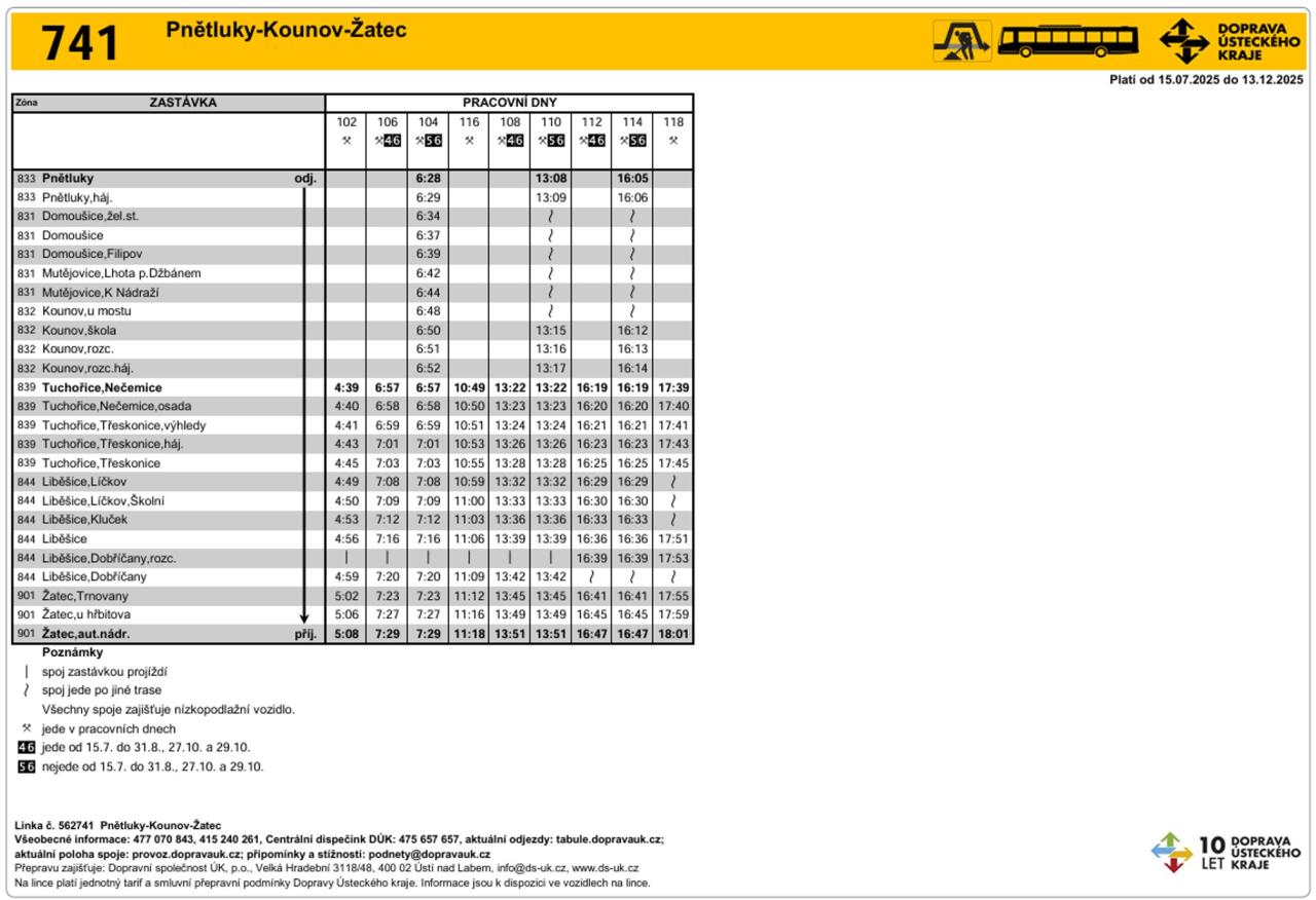 V jízdním řádu linky 741 dochází k drobným změnám, které měly podle původních předpokladů začít platit až od 31. 8. 2025. Cestujícím z/do Trnovan doporučujeme využít také vlaky linky U14 zastavující v železniční zastávce Trnovany.