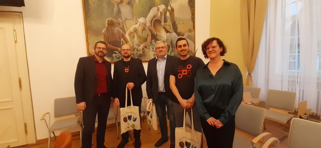 Na společném snímku zleva starosta Radim Laibl, Martin Vonka, Daniel Černý, Michal Horáček a Olga Bukovičová (koordinátor UNESCO MěÚ Žatec).