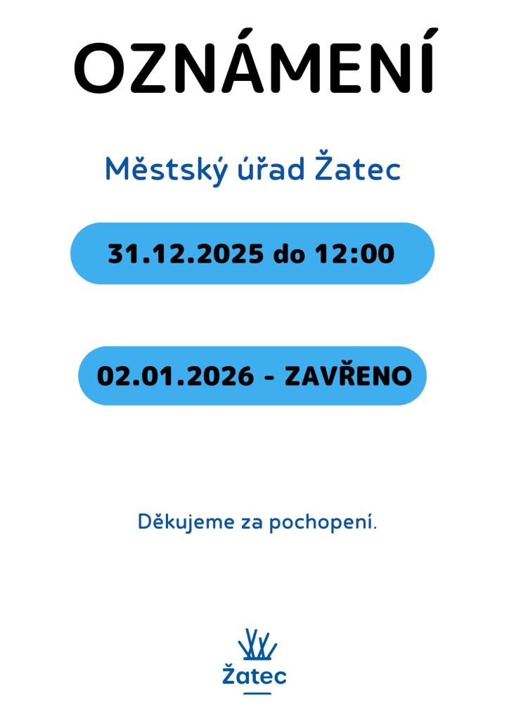 Ve středu 31. 12. 2025 bude Městský úřad Žatec otevřen do 12:00. V pátek 2. 1. 2026 bude úřad uzavřen. Děkujeme za pochopení!
