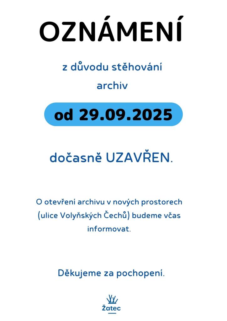 Z důvodu stěhování bude městský archiv v Žatci dočasně uzavřen. O otevření archivu v nových prostorech na ulici Volyňských Čechů budeme včas informovat. Děkujeme za pochopení!