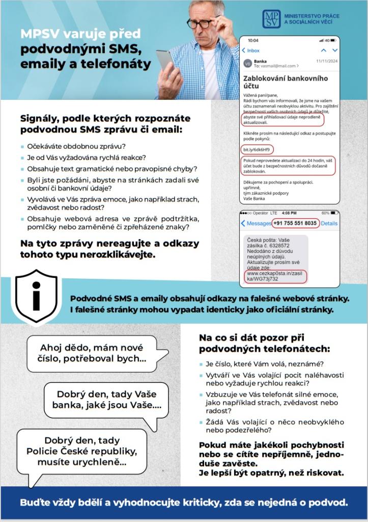 Trend podvodných zpráv není nový, avšak jeho intenzita a sofistikovanost roste. Jelikož resort MPSV vnímá kybernetické útoky za velké hrozby, připravil pro občany informační leták, ve kterém se např. dozvíte, na co si dát pozor při podvodných telefonátech, či obsahuje výčet základních signálů, podle kterých rozpoznáte podvodnou SMS zprávu a email. (red)