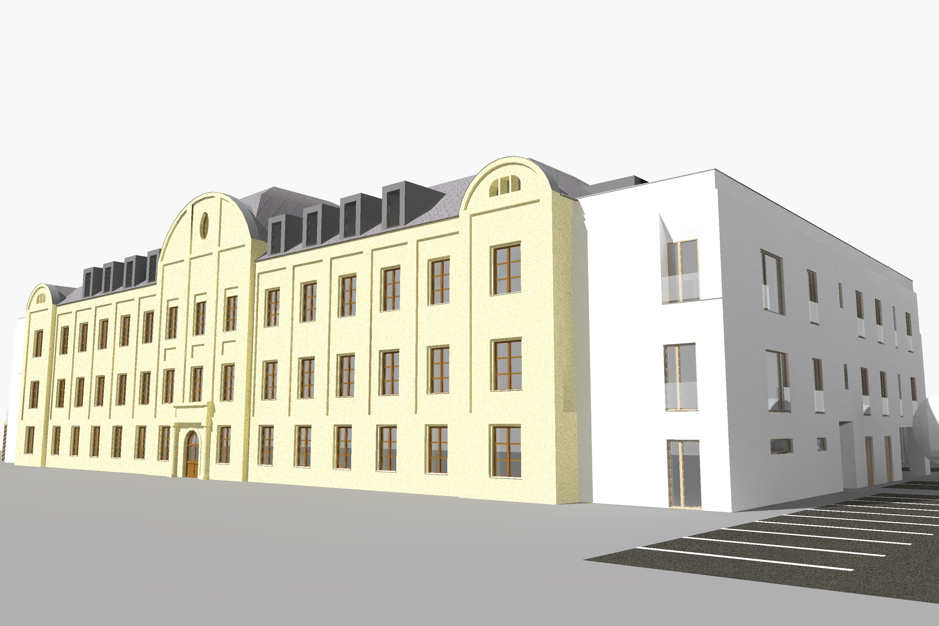 Charakter historické budovy bude částečně vrácen do původní podoby fasády, která bude dále doplněna o symetrické novodobé přístavby.