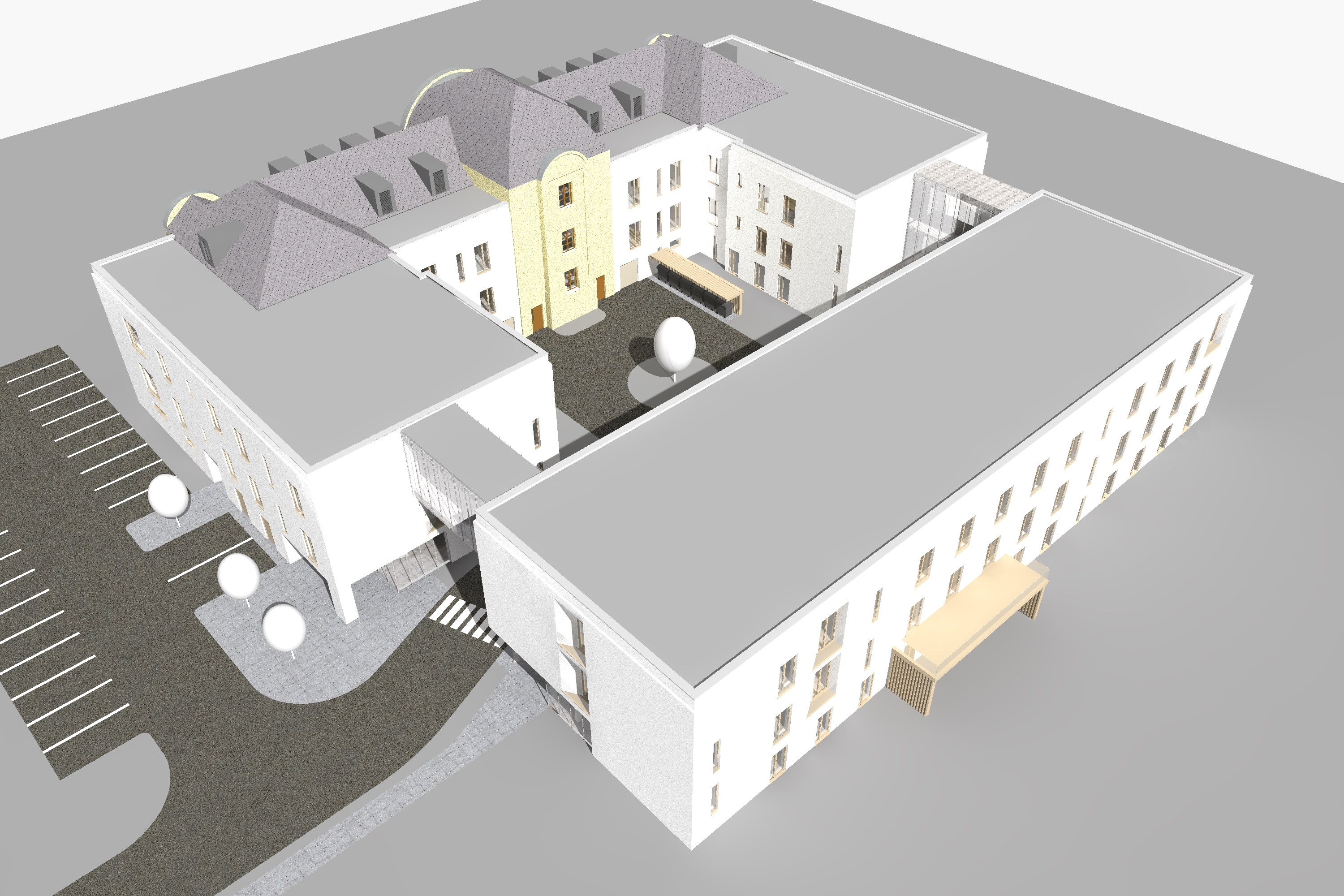 Návrh rekonstrukce a dostavby objektu následné péče a dětského oddělení vytváří jeden komplex s dvorním prostorem otevřeným severozápadním směrem